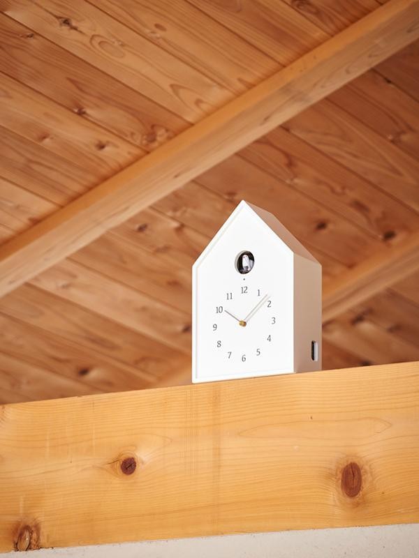 | さんかく屋根のシンプルな巣箱の形状をシナベニヤを組み立てて製作しました。シナの柔らかな木目が見えるナチュラルと、家の形が引き立つホワイトの2タイプ。控えめでもはっきり見える数字フォントに金属でできた時計の針がアクセントになっています。ライトセンサー機能付きで、就寝時など消灯時には小鳥もお休みするので安心です。 |