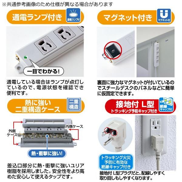 | 8個口(3P抜け止め)、VCTFコード仕様、3Pプラグ(絶縁キャップ付き・L型)のタップです。電源状態が確認できる通電ランプ付き。裏面にマグネットが付いているので、スチールのデスクなどに仮固定することができます。メンテナンスがしやすく便利です。 |