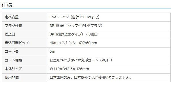 8個口(3P抜け止め)、VCTFコード仕様、3Pプラグ(絶縁キャップ付き・L型)のタップです。電源状態が確認できる通電ランプ付き。裏面にマグネットが付いているので、スチールのデスクなどに仮固定することができます。メンテナンスがしやすく便利です。 |