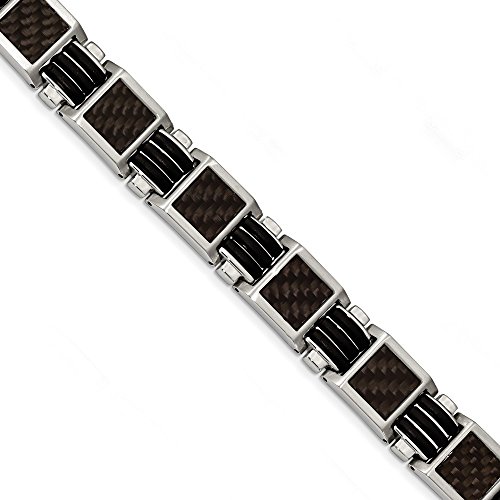 14.62mm Stainless Steel Brushed Polished Black Carbon Fiber Inlay Rubber Bracelet - 9 Inch - In Solid Stainless Steel 58.4 Grams - JewelryWeb Style: QTB347033 - FREE gift-ready jewelry box