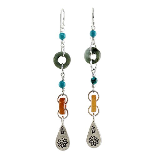 About this item: Take an adventurous approach to life with these long dangle earrings from Somluck Komolmith in Thailand. Featuring teardrop-shaped charms of hill tribe silver that are stamped with assorted traditional motifs, the earrings are crafted from jade, dyed quartz and turquoise-hued calcite. They swing from sterling silver hooks.
