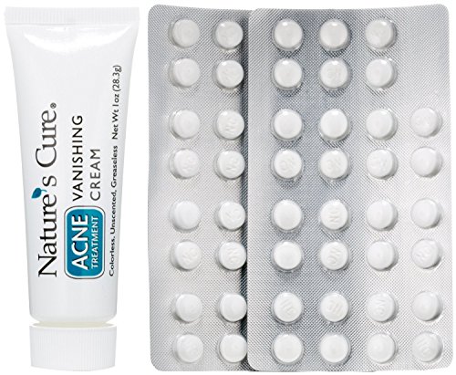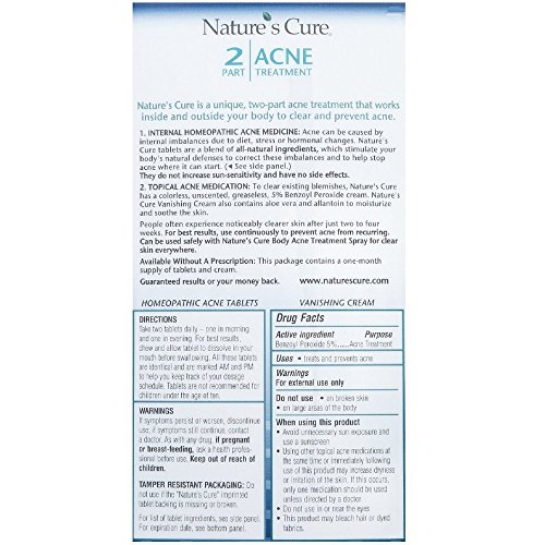 Nature's Cure is a unique, two-part acne treatment that works inside and outside your body to clear and prevent acne. Internal homeopathic acne medicine: Acne can be caused by internal imbalances due to diet, stress or hormonal changes. Nature's Cure tablets are a blend of all-natural ingredients, which stimulate your body's natural defenses to correct these imbalances and to help stop acne where it can start. They do not increase sun-sensitivity and have no side effects. Topical acne medication: To clear existing blemishes, Nature's Cure has a colorless, unscented, greaseless, 5% benzoyl peroxide cream. Nature's Cure vanishing cream also contains aloe Vera and allantois to moisturize and soothe the skin. People often experience noticeably clearer skin after just two to four weeks. For best results, use continuously to prevent acne from recurring. Can be used safely with Nature's Cure body acne treatment spray for clear skin everywhere. Available without a prescription: This package contains a one-month supply of tablets and cream.Feature