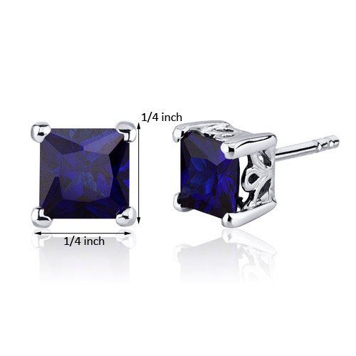 Center Stone: 2 Pieces Lab Created Blue Sapphire, Princess Cut 6 mm, 2.50 carats total weight, Ceylon Blue Hue with Brilliant Sparkle. Earrings: 2.50 grams, Pure Sterling Silver Rhodium Finish with .925 stamp, Earrings feature Stud posts with Bullet backs, exceptional Design, Craftsmanship and Rhodium Finishing. Perfect gift for Mothers Day, Birthdays, Valentines Day, Graduation, Christmas or just about any other occasion. Money Back Guarantee. Includes a Signature Gift Box & style SE8026Feature
