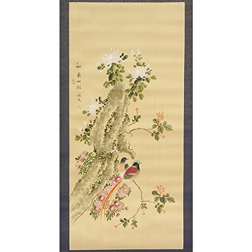 This professionally hand-painted silk scroll depicts a pair of love birds nestled together amid the branches of a flowering tree. Hanging scrolls have been used for centuries in China, often depicting idyllic natural scenes such as this one. This painting is matted on a silk brocade with a convenient loop at the top for hanging, and a scroll bar at the bottom for stability. Because it is painted by hand, each one is different and unique, making it a truly personal gift for a loved one.Feature