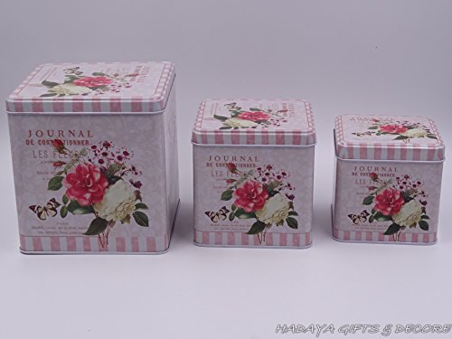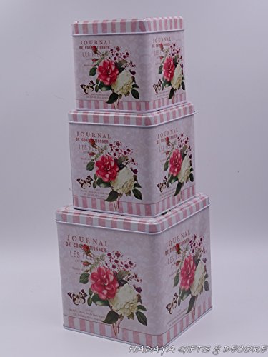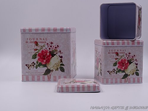 Beautiful Cookie Storage Tins, Shabby Chic, Square Shaped floral themed with floral rose design Set of 3