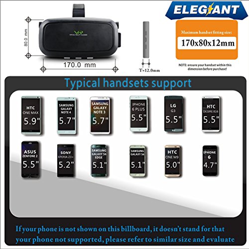 -. Binding : Electronics -. Brand : ELEGIANT -. Feature : Turn your smart phone into the ultimate 3D machine for 3D games and split screen movies; works with over 300+ iOS/Android virtual reality apps on Apple App Store and Google Play Store. Search VR or some other related keyword on Google Play or APP sto / Pupil Distance (PD) and Focal Distance (FD) both can be adjusted to get the best 3D immersive experience. Pupillary Distance adjustment range: 55mm - 75mm. Myopia less than 600 degree is ok to use this item without wearing glasses. Note: The focus ad / Fits for iPhone, Android phones and Windows phones with screen size within 6.0 inch, recommended phone size is 4.7- 6 inch. The max length*width of phone is 154mm*82mm. Fits for: Samsung Galaxy Note 4/Galaxy Note 3/ Galaxy S6 Edge/Galaxy S6/iPhone 6s / The front cover, adsorbed by magnet, is easy to be removed. It makes the phone cool while using, and it is great for ventilation for long use. You can charge and use earphone at the same time through the ventilation holes on both sides. / The surface of this 3D VR glasses is matte and it also uses a high-definition optical resin lenses. Three adjustable straps can distract part of pressure from the bridge of nose, super face foam protector, comfortable design. -. Label : ELEGIANT -. Manufacturer : ELEGIANT -. Model : ELEGIANTFurmores3855 -. MPN : ELEGIANTFurmores3855 -. PackageQuantity : 1 -. PartNumber : ELEGIANTFurmores3855 -. ProductGroup : Speakers -. ProductTypeName : CE_ACCESSORY -. Publisher : ELEGIANT -. Studio : ELEGIANT -. Title : VR Headset, ELEGIANT 2016 3D Virtual Reality Glasses Compatiblefor 4~6 inch Smartphones iPhone 6 6 Plus, Samsung Galaxy S6 edge, Note 4 3, etc.