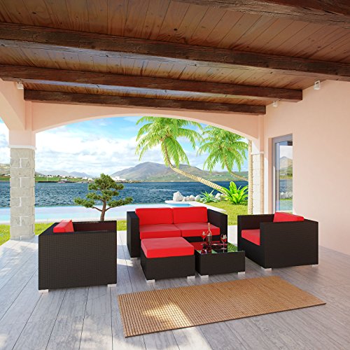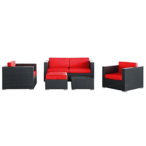 - Title : LexMod Malibu Outdoor Wicker Patio 5 Piece Sofa Set In Espresso with Red Cushions