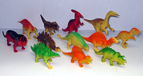 This is a wonderful set of 12 (dozen count) kids dinosaur toys - all figures are different - and measure between 5 inches and 7 inches long. Made from hard plastic these snap-together dinos are - Durable and Strong - Constructed using safe materials - BPA free - Lead free - Extremely rugged for hard wearing use! You can easily collect these and are ideal for playtime indoors or outdoors. Includes your favorite Dinosaurs like the T-Rex, Stegosaurus, Triceratops, Velociraptor etc. All of them stand up easily. Educational and fun for home, school, science projects, collecting, parties, cake toppers, for boys and girls, these toys are awesome and collectible too. If they crush or break you can snap them back together and bring the Jurassic world back to life like a Dinosaur Doctor !