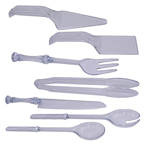 - Plastic Serving Utensil Set includes 1 Tong, 1 Fork, 1 Knife, 1 Salad Spoon, 1 Slotted Salad Spoon and 2 Cake servers