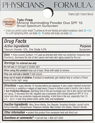 ReleaseDate : 2014-09-01 Studio : Physicians Formula Publisher : Physicians Formula Binding : Health and Beauty Product Description Blend 1 plus 2 for the perfect shade Custom Mineral Duo allows you to create your perfect shade. The formula is specially designed to help reduce the risk of irritation and breakouts. 2 Custom Colors:- Foundation Coverage- Radiant Finish To achieve an all-over flawless and radiant complexion, blend 1 plus 2.For a soft highlighting effect, use shade 1. To contour and sculpt, use shade 2.The Talk on Talc Gentle, talc-free, minimalist formula allows skin to breathe. Can help minimize the risk of irritation and breakout. Eliminates the look of a chalky, dry finish. Mineral Wear for a Natural Wear Minerals such as Mica provide a smooth, "second skin" feel and finish. A Daily Dose of Vitamins and Minerals Derivatives of Vitamins A and E, natural anti-oxidants, help to protect and condition the skin. 0