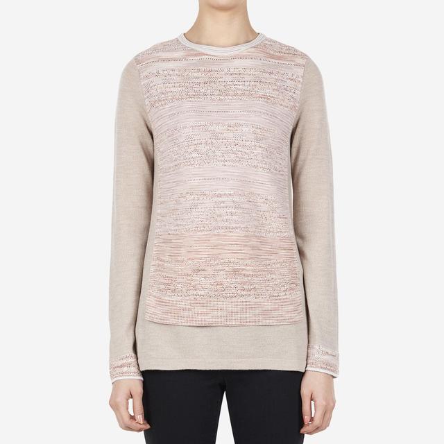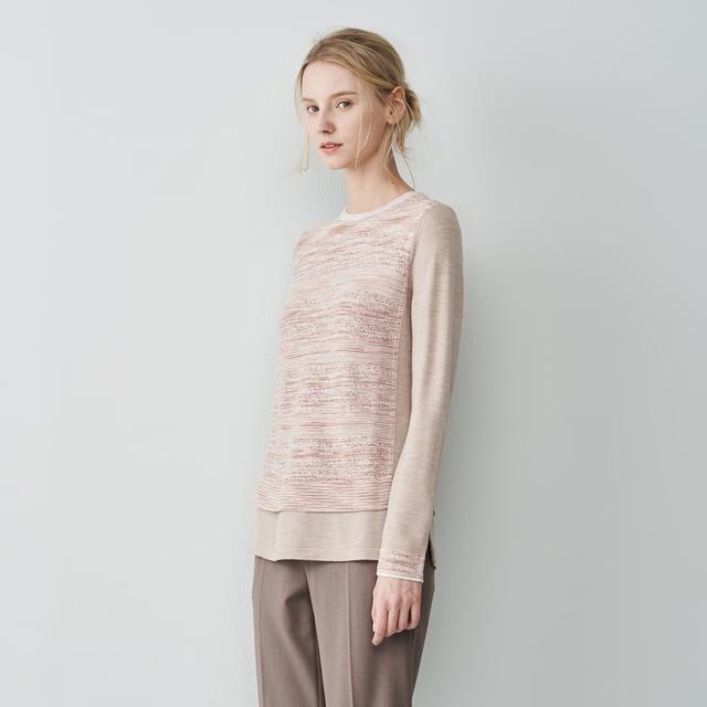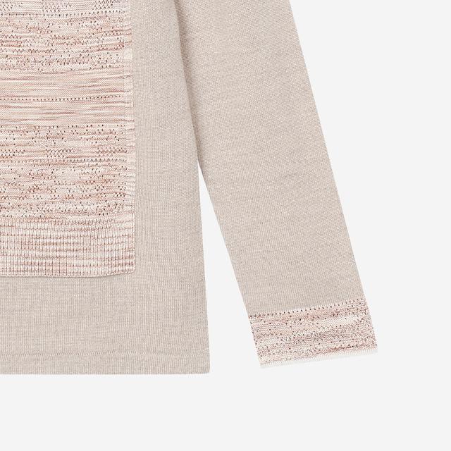 독특한 패턴의 멜란지 컬러감에 펀칭 디테일 패치 장식으로 포인트를 주어 멋스러운 외관을 보여주는 니트입니다.