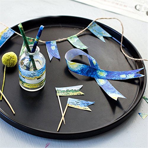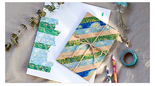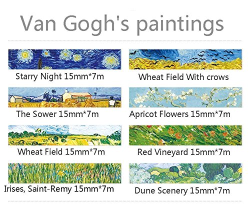 - 8 Style Van Gogh painting,width 0.59inch (1.5cm), length 23ft (7m) each roll; PATTERNS: 1 x The Starry Night; 1 x The Sower; 1 x Wheat Fields; 1 x Wheat Field with Crows; 1 x Irises, Saint-Remy; 1 x Almond Blossom; 1 x The Red Vineyard; 1 x Dune Scenery; each sticker is about 1.4 x 1.4 inch.