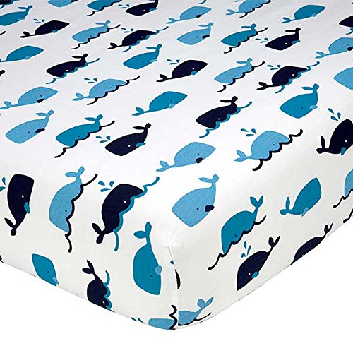-. Feature : 100% Cotton Fitted Crib Sheet is a stylish addition to your baby's nursery featuring blue whales / Fabric is 100% cotton, providing the optimal mix of durability, beauty, breathability, and ease of care / Fitted sheet is fully elasticized with an 8 inch pocket to fit all standard sized 52 by 28 inch crib mattresses; designed specifically to make those middle of the night sheet changes quick and easy / Made with busy new moms in mind; just machine wash and tumble dry / Complete the dressing of your crib with the coordinating Whale of a Tale crib bedding set and nursery decorating accessories