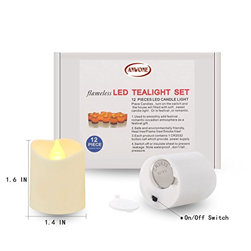 Studio : Bees Trump Publisher : Bees Trump Product Description Colour:White | Size: 1.3inch*1.4inch If you tired of Traditional Candles that Melt,Drip,Smoking,risk of fire when lighting? No longer will you have to worry about these. ANWONE LED Candle Lights are flameless and smoke-free, absolutely no fire hazards or burning risks.These 3D flameless tea lights are perfect for pillar holder,tea light chandelier,cups,votive wraps,yellow paper lanterns,boxes and holder hanging.Can be used for restaurants,hotels,catering halls, churches,home decoration,outdoor settings,special events,parties,concerts,and festivals. Specification: -Material: LED PP -Size: Diameter 1.3inch*1.4inch -Battery: CR2032 button cell -Battery life:100 hours -Light color: Warm White -Appearance color: white. Package includes: -12 X LED tea light candle -12 X CR2032 button cell The flameless tea lights is designed to flicker in a realistic way so that one can feel the ambience of an actual candle flame without any hazard or hassles.These candles can also be given away as gifts or party favors. 0