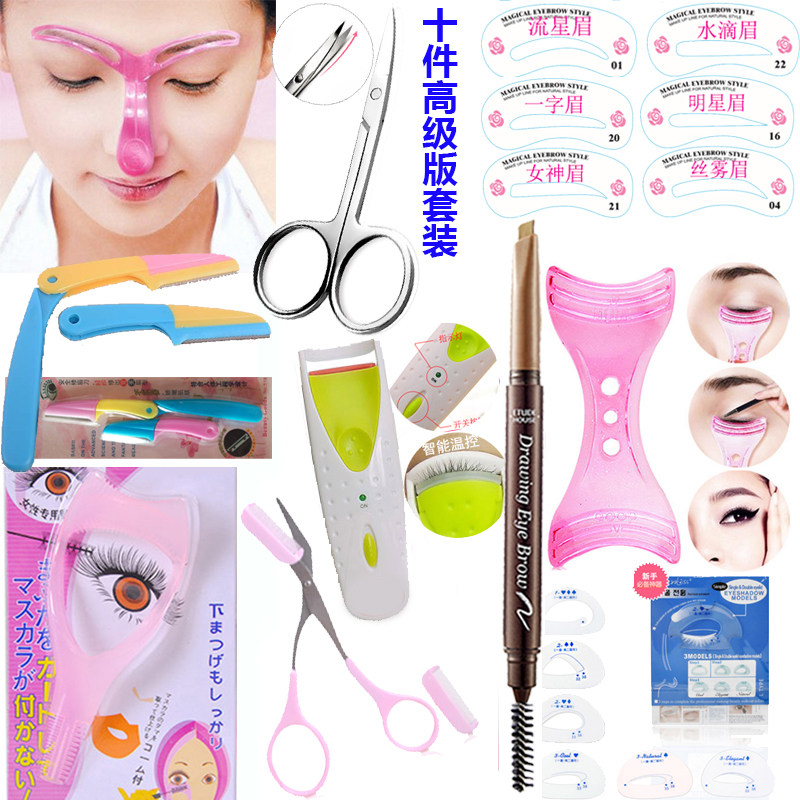 【10样眼部套餐】=不锈钢小剪刀+画眉神器一代或者二代+修眉带眉梳剪刀+双头修眉刀+眉卡6个眉形(丝雾眉+女神眉+水滴眉+流星眉+一字眉+明星眉)+电动夹睫毛神器+画眼线神器+画睫毛神器+画眼影神器+眉笔+送(收藏宝贝送画眉神器+猫眼卡)