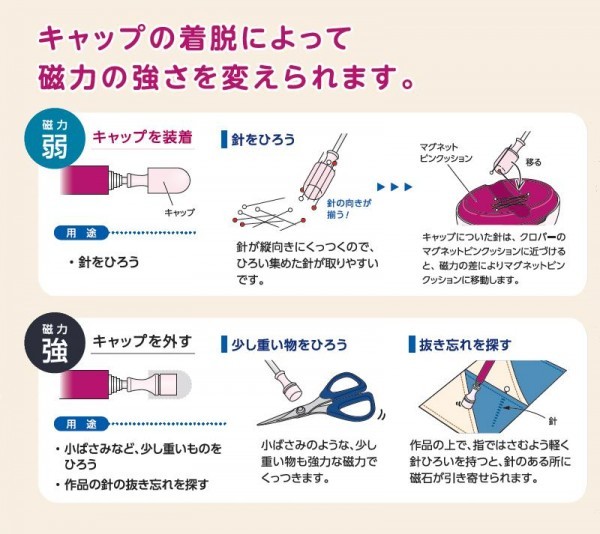 強力な磁石が入った、伸縮する針ひろいです。60cmの長さまで伸びるので、床に落ちた針もらくらく拾い集められます。小さなお子さまやペットのいるご家庭にもオススメです。 |