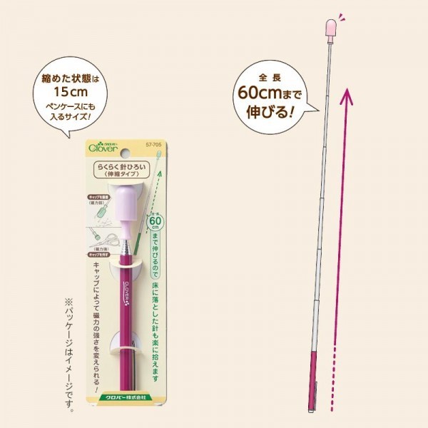 | 強力な磁石が入った、伸縮する針ひろいです。60cmの長さまで伸びるので、床に落ちた針もらくらく拾い集められます。小さなお子さまやペットのいるご家庭にもオススメです。 |