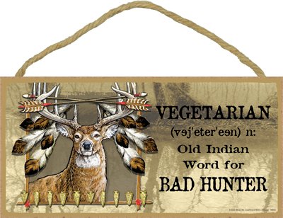 (SJT00620) Vegetarian (v?j'eter'e?n) n: Old Indian Word for Bad Hunter 5" x 10" wood plaque, sign - Features the artwork of Buckwear