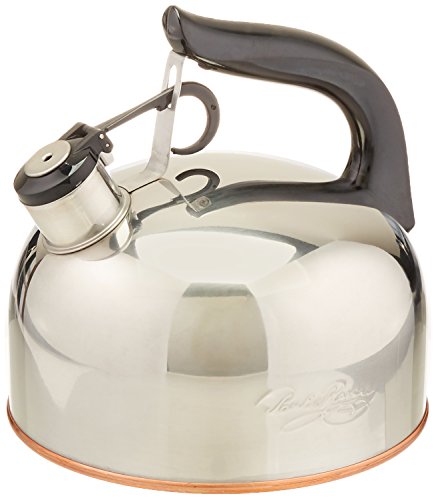 Polished stainless steel kettle is fashioned after the older tea kettles you may remember, with a big advantage � all copper bottom. Water heats evenly, which means you won�t have to wait as long. Spout only opens when you pull back the trigger handle Fill and heat on your stove; whistles when water is ready Holds 2-1/3 qt 6-3/4"H, base 7"OD, approx. 1 lb ChinaFeature