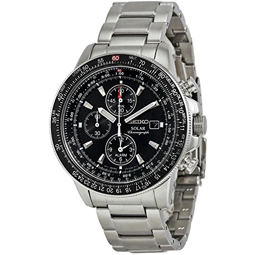 From the master craftsmen at Seiko, the Seiko Men's SSC009 Black Dial Flight Watch is a cutting-edge timepiece with a masculine appeal. Featuring a black analog dial and a silver stainless steel band, this watch is packed with style and would be a great addition to your watch collection.