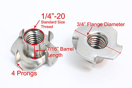 Stainless T-Nuts, 1/4"-20 Inch, (25 Pack), Threaded Insert, Choose Size/Quantity, By Bolt Dropper, Pronged Tee Nut. (1/4"-20 x 7/16")