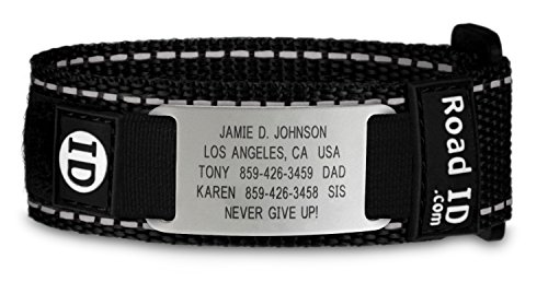 The Wrist ID Sport is made of woven nylon with a hook & loop closure with a laser-engraved stainless steel faceplate. Road ID wristbands can be adjusted to fit most wrists and come in four (4) colors.