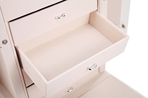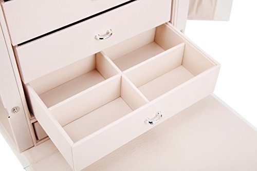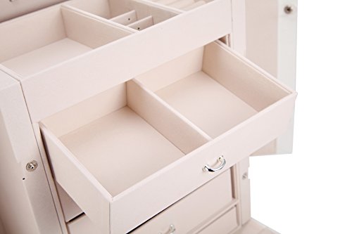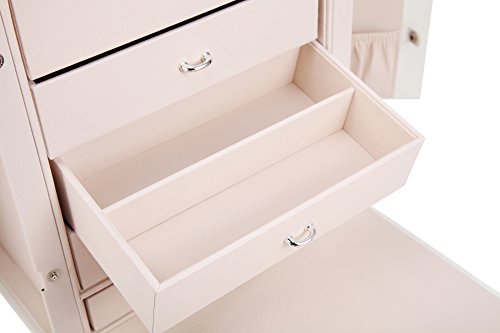 SPACIOUS ROOM FOR STORAGING DIFERENT KINDS OF JEWLERIES. 5 slide out deep drawers with removable dividers; 3 large storage pouches; 15 hooks. It has enough room to keep your necklaces, bracelets, rings, earrings, watches and your other jewelries organized and neatly displayed.