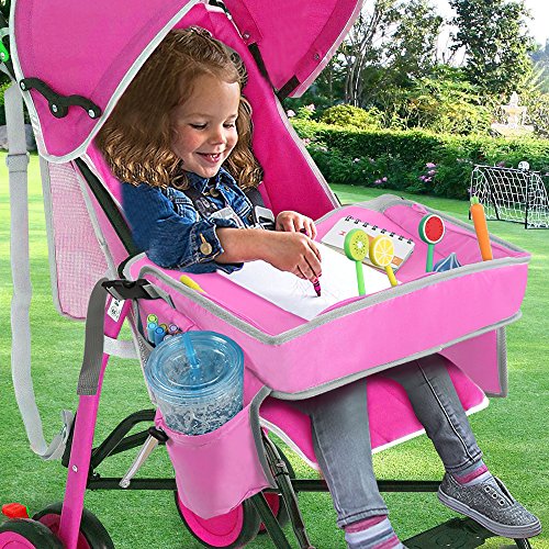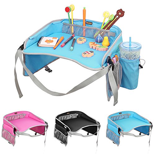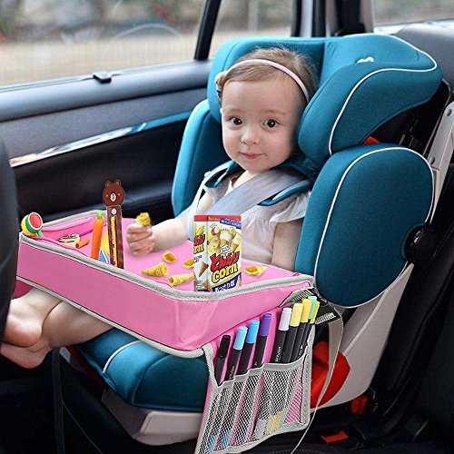 KEEPS YOUR KIDS CHEERFUL WHILE TRAVELING: Kids stay happy & content on car, bus, train or plane rides! This tray makes eating & playing easier, while front and side storage pockets keep crayons, paper & cards right at little fingertips (also has cup holders for drinks). Kids are less frustrated when they can easily reach the things they need!
