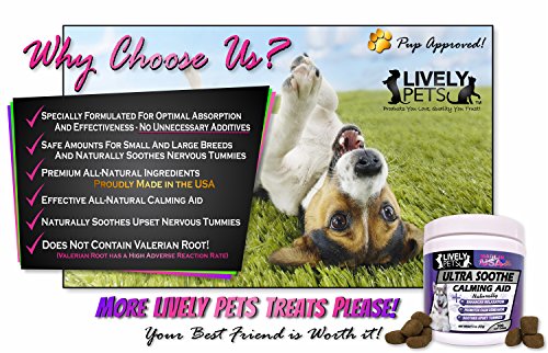 ULTRA SOOTHE is a powerful ALL-NATURAL calming aid soft chew for dogs. Our chews are made using all-natural elements found in nature to help your dog relax in times of stress and anxiety. With pure ingredients like Chamomile, Ginger Root, Passion Flower, and L-Tryptophan, your dog will feel calmer and safer, as well as receiving relief from any tummy trouble that may accompany anxiety. Ultra Soothe Calming Aid treats are a great way to combat nervousness that may accompany situations like: Separation Anxiety, Travel Anxiety, Thunderstorms, Grooming, Vet Visits, New Visitors, Fireworks, Car Rides, Crating, Crowded Public Places, and many more.Lively Pets Ultra Soothe can calm your dog down and mellow out other anxieties that manifest in Jumping, Barking and Excessive Chewing. Ultra Soothe treats are also a great relaxant, helping nervous pets get to sleep easier!