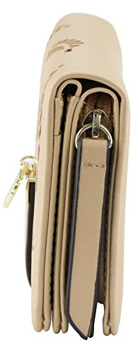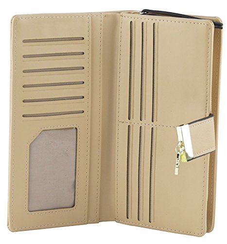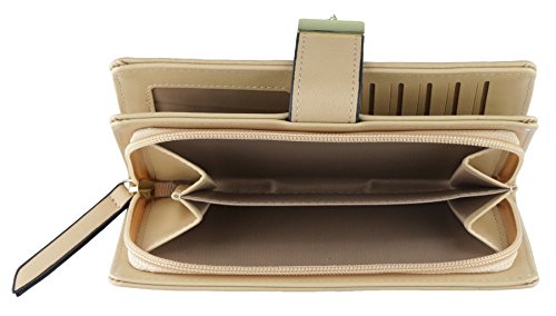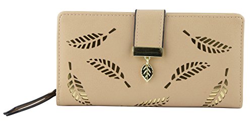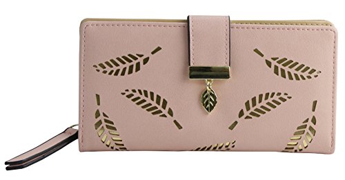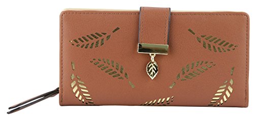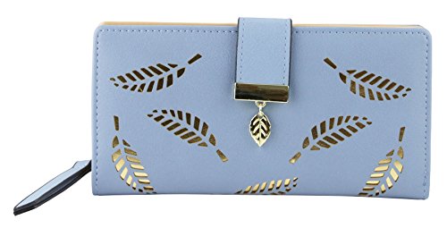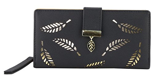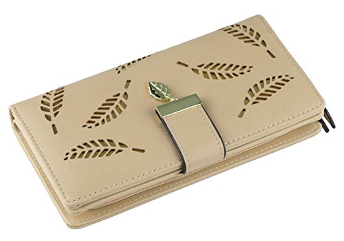 Product Description Eital Women's Leather Cut-Out Leaf wallet has a beautiful gold inlay that shines through the leather cut-outs. The leather is cut with clean lines and no fraying. There's a strong snap clasp closure and the coin purse's zipper glides smoothly without catching. This is a light-weight thin wallet that is able to keep your ID in a window, 11 credit cards, has 2 large pockets, a place for your cash and a section for smartphone, 3 side pockets that are checkbook sized. This is the perfect wallet for someone who needs something just for their essentials. This is an elegant wallet for every woman. 0