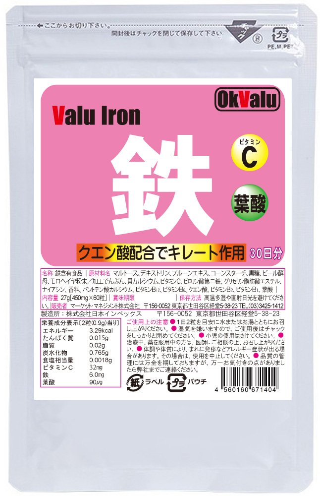 2粒で鉄分が6㎎補給できます。 飲みやすいラグビー型タブレット。 クエン酸を配合していますからキレート作用でミネラルの吸収力も向上。 持ち運びにも便利なパウチタイプですから、いつでもどこでもお飲みいただけます。 こんな方にお勧めします。 ●栄養バランスが気になる方に。 ●野菜・果物不足の方に。 ●毎日の元気が気になる方に。 ●美容が気になる方に。