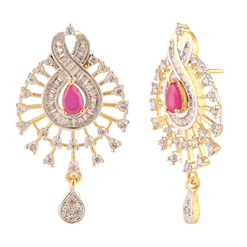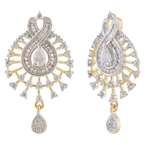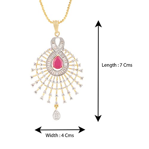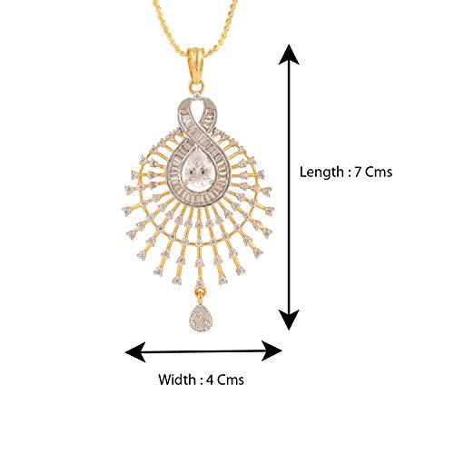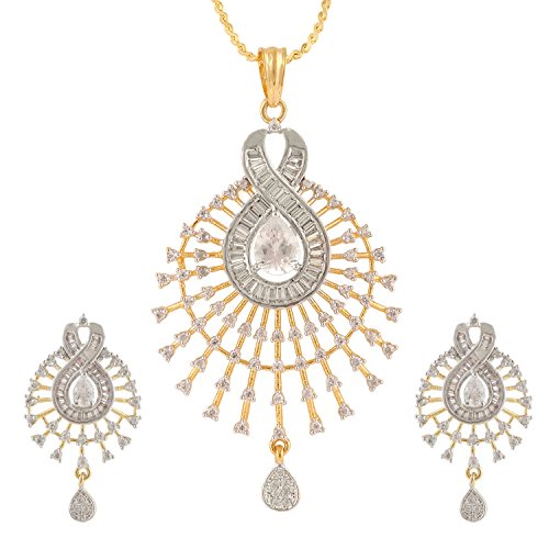 -. Feature : Swasti Jewels Sparkling Zircon Pendant Sets a perfect gift for Every P.R.Incess . Ideal Gift for Loved ones. / Style: A gorgeous beautiful american diamond traditional Pendant Set with matching Earrings. Chain is a part of the Product. / Colors: Gold with American Diamonds and Rhodium Plated. No of Items : 1 Pendant ( Size 7 cms x 4 cms ) with chain + 1 Pair of Earrings ( Size 4 cms x 2 cms ) / Styling tip: Wear with an ethnic outfit for any occasion. This traditional set will complement any Indian attire. Ideal Gift for Loved ones, Wife, Mother, Sister. Excellent gift for Birthday, Anniversary, Festivals and Celebrations. / Stone Creation : Synthetic ; Stones: Cubic Zirconia & American Diamonds