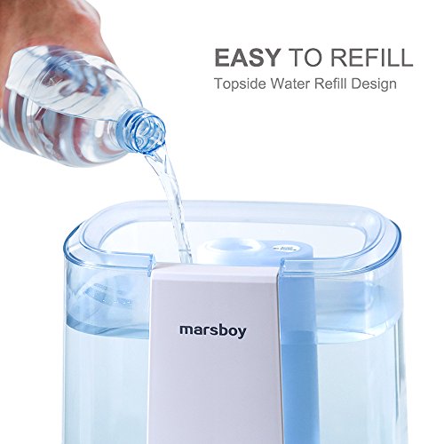 Huge Capacity & Topside Water Refill- marsboy Ultrasonic Cool and Warm Mist Humidifiers are designed with 6L (1.6 gallons) water tank which can serve you during the whole night continuously. Refill the water tank with your handy mug or other containers from the top!