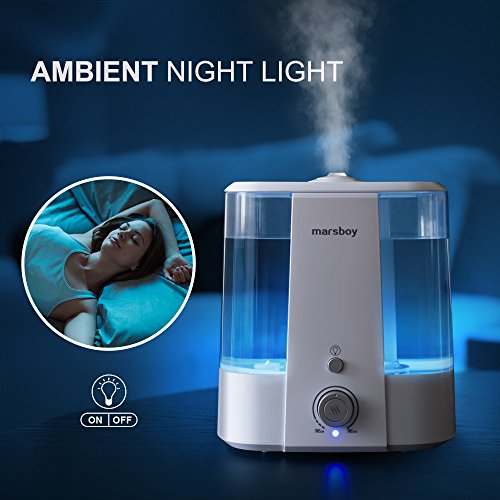 Super Quiet Operation & Ambient Night Light- marsboy Ultrasonic Cool and Warm Mist Humidifiers can ensure your good sleep with advanced Super Quiet Operation and adjustable LED Night Light can light up your night peacefully.