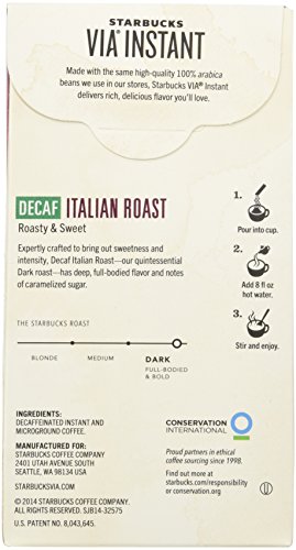 When we set out to create Starbucks VIATM Ready Brew, we wanted an outstanding cup of coffee that we could enjoy anywhere, at any moment. And now with the launch of Starbucks VIATM Decaf Italian Roast "anytime" includes those occasions that call for the rich, bold taste of coffee - but not the caffeine. Sharing with guests after a dinner party? Relaxing on your red-eye flight? Rushing off to an afternoon meeting? You'll find all of these situations (and a thousand more) are perfect for our high-quality, 100% arabica, naturally decaffeinated instant coffee.Feature
