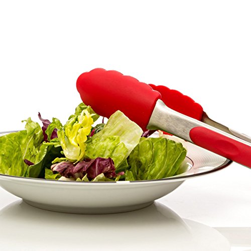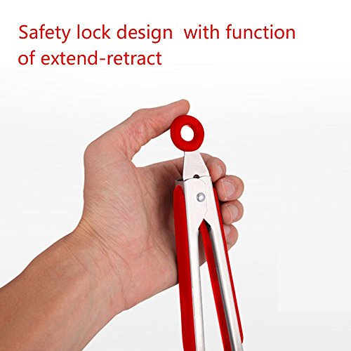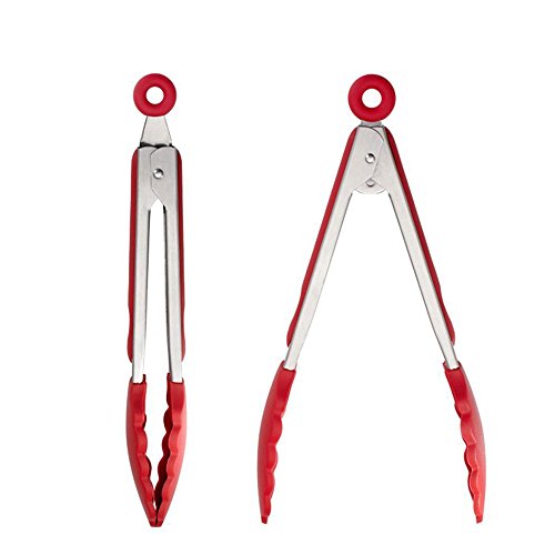 Red 9 &12 Inches Heat resistant Silicone Portable Stainless Steel Kitchen Salad Tongs with Cooking Grill Tips