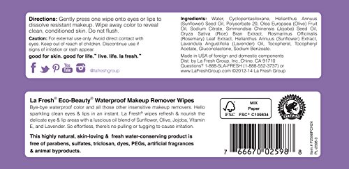 Bye-bye waterproof color and all those other insensitive makeup removers. Hello sparkling clean eyes and lips in an instant. La fresh wipes refresh and nourish the delicate eye and lip area with a luscious 6-oil blend of olive, jojoba, sesame, grapeseed, vitamin e and lavender. So effortless, there’s no pulling or tugging to cause irritation. Natural lavender aromatherapy.
