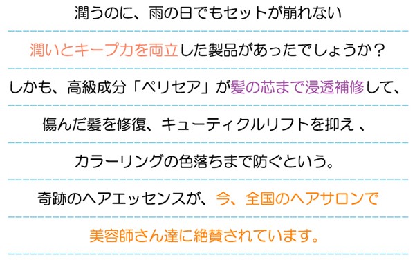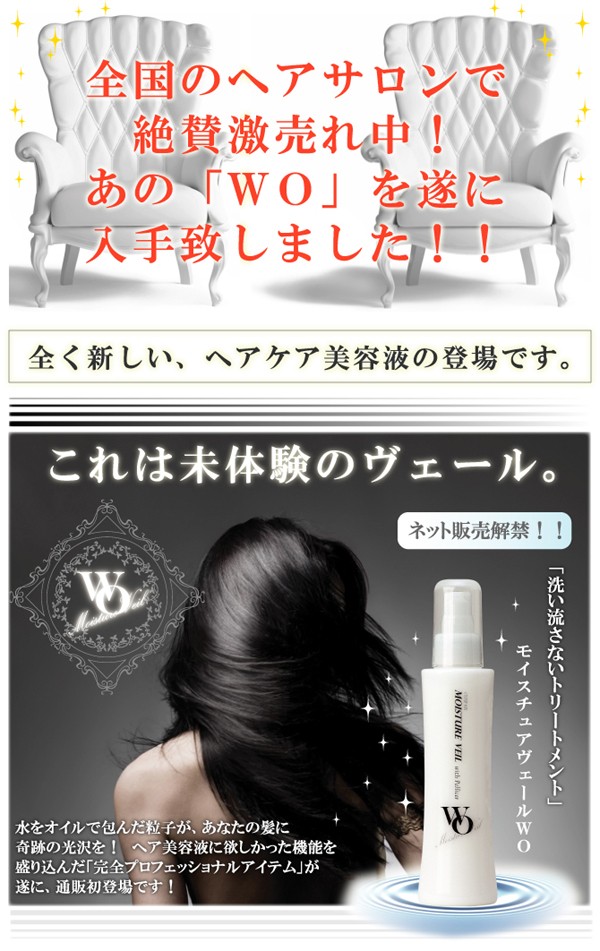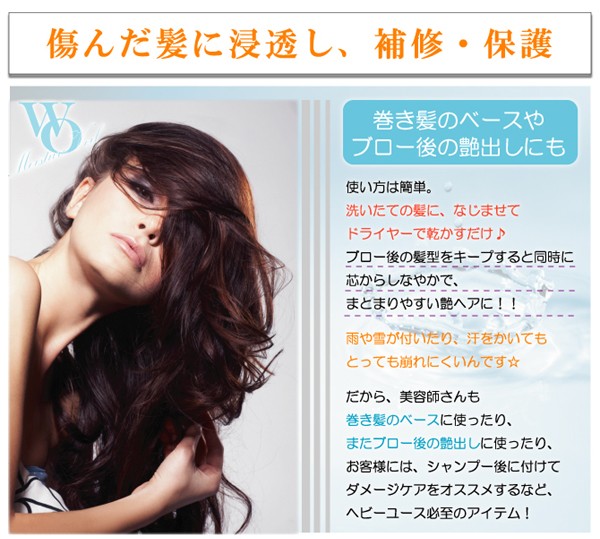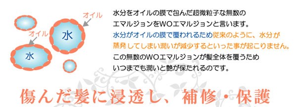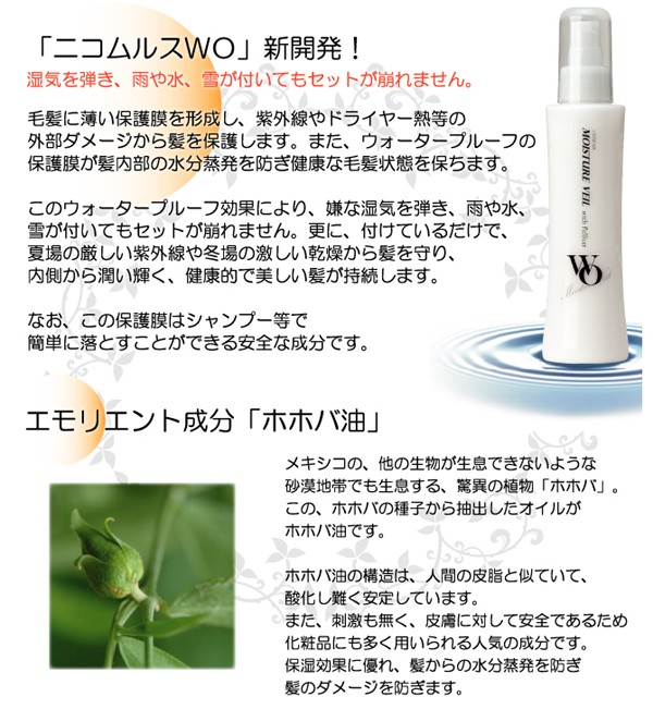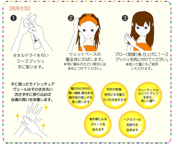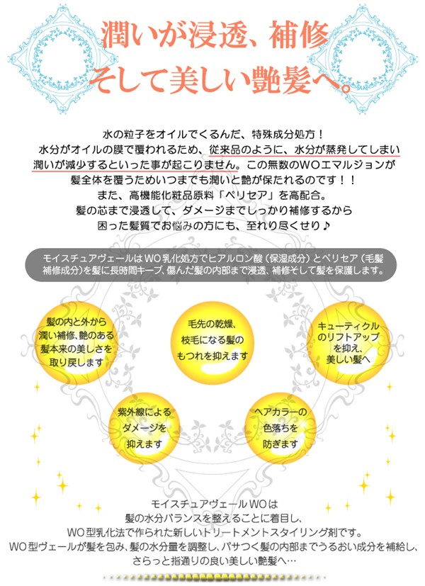 | 製品特徴 | モイスチュアヴェールは WO乳化処方でヒアルロン酸(保湿成分)とペリセア(毛髪補修成分)を髪に長時間キープ、傷んだ髪の内部まで浸透、補修そして髪を保護します。 ●髪の内と外から潤い補修、艶のある髪本来の美しさを取り戻します。 ●毛先の乾燥、枝毛の原因となる髪のもつれを抑えます。 ●キューティクルのリフトアップを抑え、美しい髪に仕上げます。 ●紫外線によるダメージを抑えます。 ●ヘアカラーの色落ちを防ぎます。 |