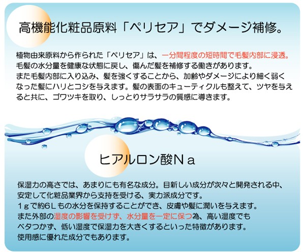 | ご使用方法 | 適量(セミロングで2~3プッシュ)を少量ずつなじませて下さい。 ぬれた髪にも乾いた髪にもお使い頂けます。 |