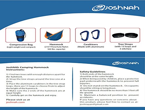 MADE TO LAST - This JoshNAh Double Hammock is made with strong attention to detail. Every part is high quality. The Hammock is 210T parachute nylon. Both Tree Straps and Hammocks have 3 stiches and Carabiners are Aluminum. The hammock is big and all parts are sturdy enough to fit 2 or 3 people up to 500 pounds.