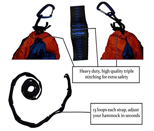 QUICK AND EASY SETUP - This complete set is an easy set up, and will make you relax in just few minutes. Because the 9 feet tree straps are adjustable with 13 loops, you can easily adjust the height of your double hammock without moving them by clipping the aluminum carabiners into the strap loops!