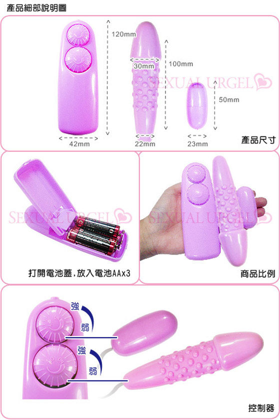 Compared with ordinary double Tiaodan Tiaodan simulation more realistic,our 12.5 cm long 5 cm long short eggs. Simulation of large head longTiaodan carotid body with granular processes more to enhance female stimulation. Can also stimulate the vagina and anus. Multi speed vibration!