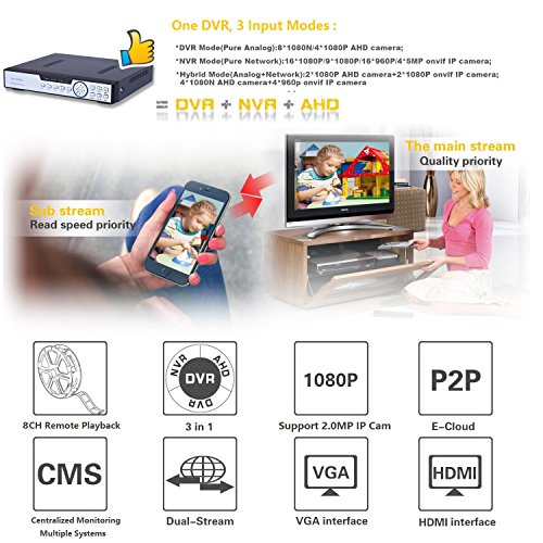 -. Feature : 16CH Analog+AHD+IP 3-in-1 Advanced Hybrid DVR security system--Support 1080P/1080N AHD Camera/1080P Onvif IP camera,HDMI and VGA output.NOTE:HD-SDI camera is not workable with HISVISION HVR