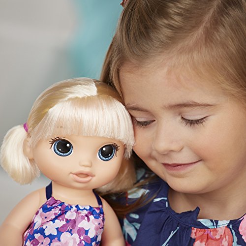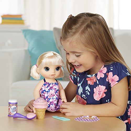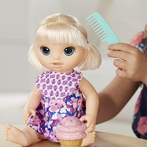 Share a sweet experience with the Baby Alive Magical Scoops Baby doll! Girls and boys can have fun preparing the pretend ice cream cone for their baby to eat. Press the scooper against the cone to begin making her snack. Pretend to add toppings, too -- shake the sprinkles shaker to hear a fun noise. Press the ice cream cone against the doll's mouth. . .all gone! The scoop retracts into the cone so kids can pretend she's eaten all of her yummy dessert. Press the cone again and again to play out lots of sweet times together. Pretend to wipe her face after her tasty treat using the included bib. The Magical Scoops Baby doll also comes with a comb for brushing her rooted hair before or after enjoying her cone. Baby Alive and all related properties are trademarks of Hasbro.Feature