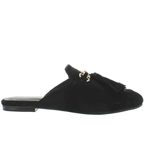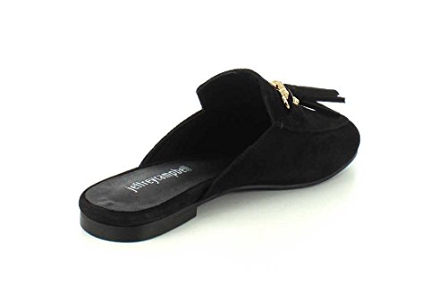 Product DescriptionSmooth suede Jeffrey Campbell mules styled with polished hardware and tassels at the vamp. A padded footbed adds comfort. Low, stacked heel and synthetic sole.0