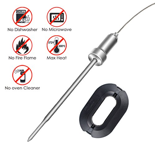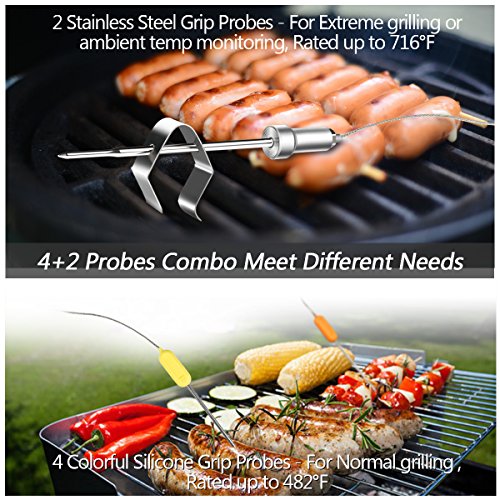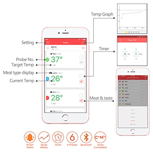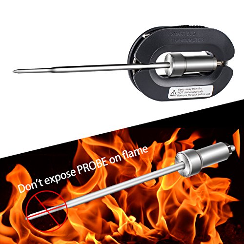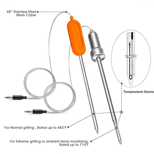Permanently Free App The device needs to work with Smart BBQ Meter which is installed on your iPhone or Android phone. Temperature Range Colorful silicone grip probes Wire - For Normal grilling , Rated up to 428°F Stainless Steel grip probes Wire - For Extreme grilling or ambient temp monitoring, Rated up to 716°F ? Don\'t expose probe or probe wire to open flames or barbeque.?