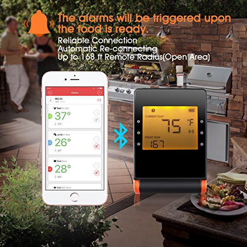 Simply plug the probe into the meat, and choose the type and the degree of doneness in the App,You will know the real time status of six foods at the same time with your phone or iPad, even you are 168 feet away! It will alarm on both the device and your phone when the food is ready.
