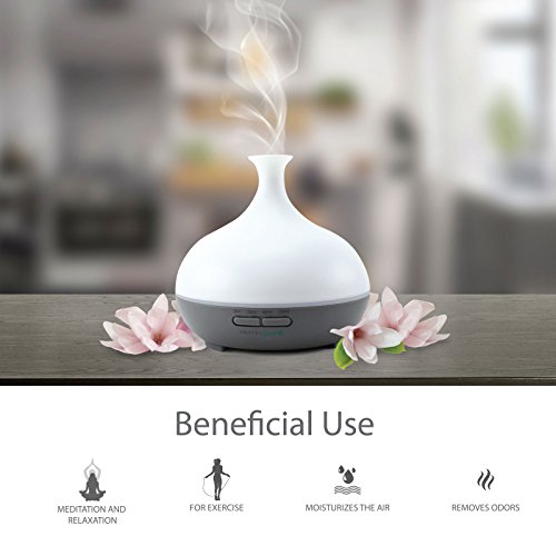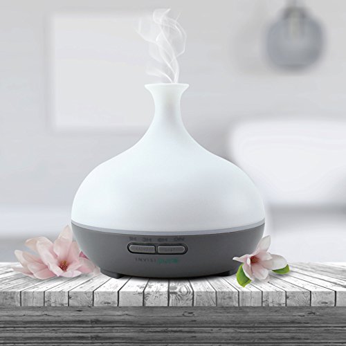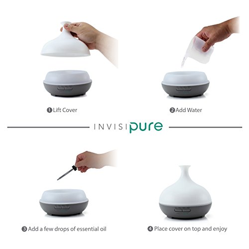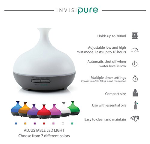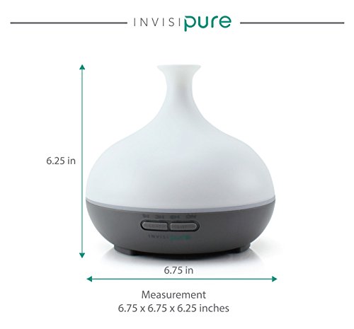 Product Description The InvisiPure Drop Aroma Diffuser can be used with your favorite essential oils. The aromatherapy diffuser uses cool mist ultrasonic technology to disperse ultra fine mist into the air. The unit measures 6.5 x 6.5 x 6.25 inches and holds up to 300ml of water. 0