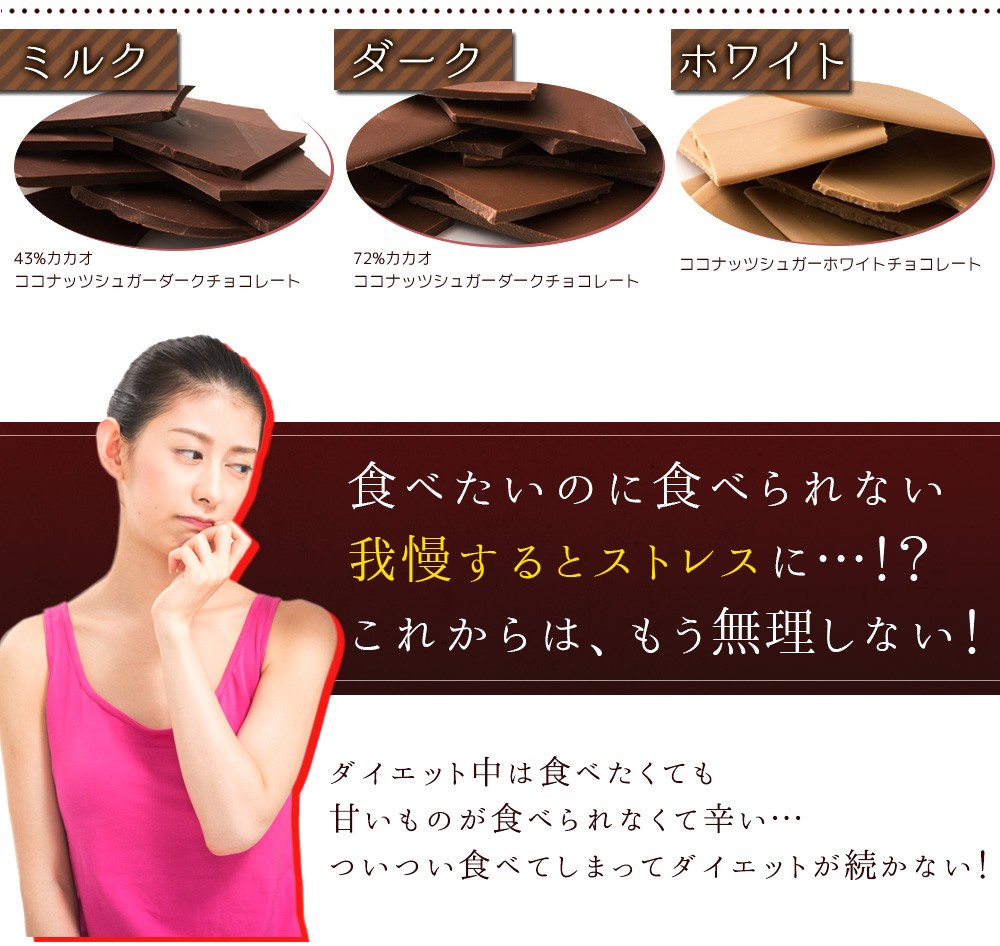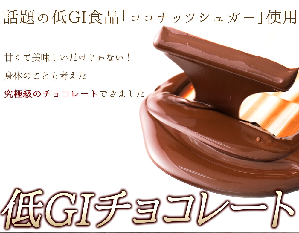 | ・72%カカオココナッツシュガーダークチョコレート(ダークチョコ):エネルギー564kcal/たんぱく質8.8g/脂質41.3g/炭水化物44.7g/ナトリウム71.3mg ・43%カカオココナッツシュガーミルクチョコレート(ミルクチョコ):エネルギー588kcal/たんぱく質8.5g/脂質41.9g/炭水化物46.1g/ナトリウム76.8mg ・ココナッツシュガーホワイトチョコレート(ホワイトチョコ):エネルギー622kcal/たんぱく質6.9g/脂質46.7g/炭水化物43.6g/ナトリウム117mg |