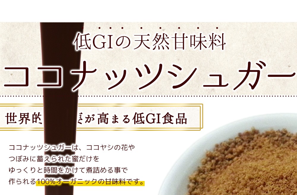 | ココヤシの花のつぼみの蜜から作る、天然の甘味料のことです。ヤシの中でもココヤシの花やつぼみに蓄えられた蜜だけを採取し、ゆっくり時間をかけて煮詰めて作られる100%オーガニックな甘味料です。 自然食材であるココナッツシュガーは、天然のミネラル成分に富み、マグネシウムや鉄分、亜鉛、カリウム、ビタミンB郡、アミノ酸など様々な栄養素を含んでいます。また、最近は低GI食品としても注目されています。体内で血糖値が上昇する数値をGI値と言いますが、白砂糖が109あるのに対して、ココナッツシュガーはわずか35と低く、低GI食品と呼ばれています。低GI食品は体内にゆっくりと吸収される特徴があります。 |